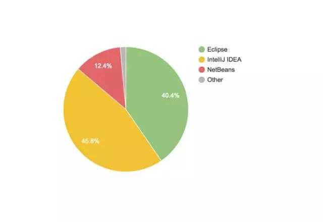 對應(yīng)的是sublime、atom……從這個角度講,VSCode無疑是最成功的,正在蠶食競爭對手的市場。而JetBrains系列對應(yīng)的是 Visual Studio。如果按語言區(qū)分,Java(Android) 陣營的 IDE 正在被 JetBrains 蠶食。從去年(2016)IntelliJ IDEA 就超越了 Eclipse,下圖是今年的份額: