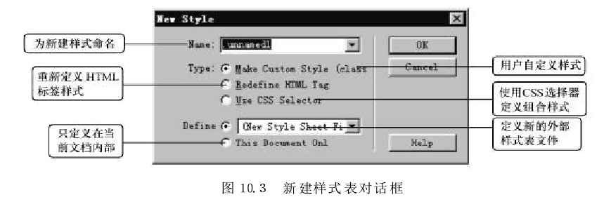 在圖10.3所示"New Style" 對話框中的“Name”選項中輸入樣式名稱.my-css-1”。在"Define"選項組中選擇 "This Document Only" 單選項,單擊"OK"按鈕。