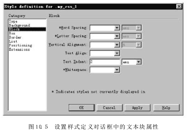 在圖10.4所示對話框的"Category"列表框中,選擇"Block" 項,出現(xiàn)"Block"設置面板,設置mycss_1樣式的屬性,如圖10.5所示,單擊“OK" 按鈕。在如圖10.2所示的CSS樣式面板上將出現(xiàn)新定義的樣式my-css_1.