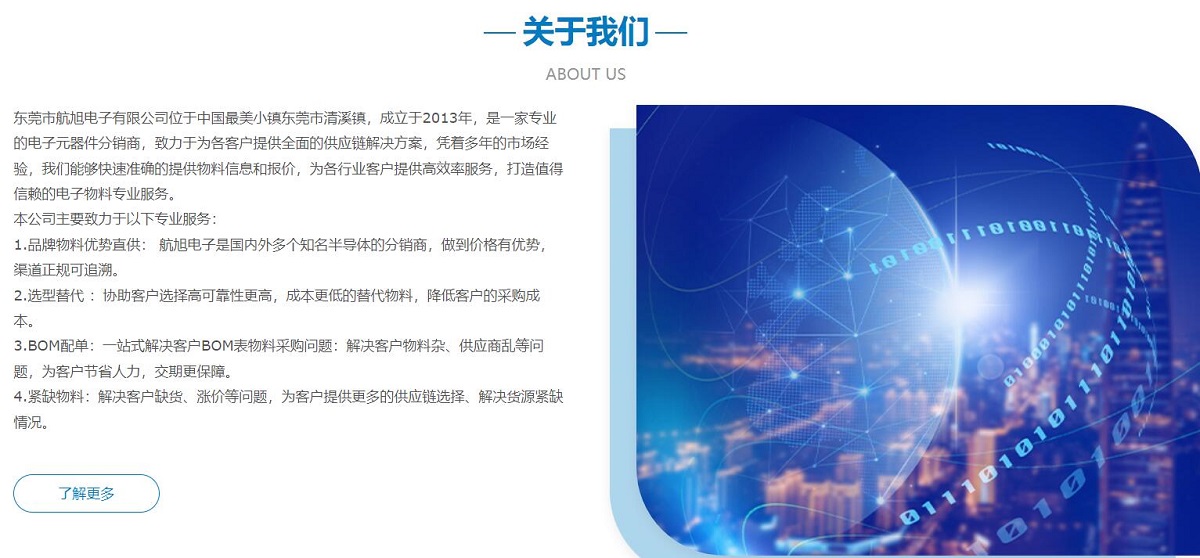 東莞市航旭電子有限公司位于中國最美小鎮(zhèn)東莞市清溪鎮(zhèn),成立于2013年,是一家專業(yè)的電子元器件分銷商,致力于為各客戶提供全面的供應(yīng)鏈解決方案,憑著多年的市場經(jīng)驗(yàn),我們能夠快速準(zhǔn)確的提供物料信息和報(bào)價(jià),為各行業(yè)客戶提供高效率服務(wù),打造值得信賴的電子物料專業(yè)服務(wù)。