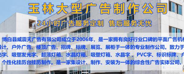 博白縣威*天廣告有限公司是一家技術(shù)先進(jìn)、實(shí)力雄厚,集廣告設(shè)計(jì)、戶外廣告、樓頂廣告、招牌、標(biāo)牌、展覽、展柜于一體的專業(yè)制作公司。致力于門(mén)頭LED發(fā)光字、吸塑發(fā)光字、超薄燈箱、水晶燈箱、吸塑燈箱、水晶字 、PVC字、標(biāo)識(shí)標(biāo)牌、戶內(nèi)外廣告、個(gè)性化掛歷臺(tái)掛歷制作。是一家集設(shè)計(jì)、制作、安裝,為一體的綜合性廣告公司。專業(yè)制作數(shù)碼寫(xiě)真、噴繪、印刷彩業(yè)、海報(bào)、絲網(wǎng)印、條幅、錦旗、彩旗、綬帶、衣服印字、禮品印字、字牌、制度牌、胸牌、標(biāo)牌、廣告牌、樓牌、銅牌、鋁牌、門(mén)牌號(hào)、門(mén)頭、燈箱、金卡、銀卡、貴賓卡、會(huì)員卡、胸卡、展板、X展架、易拉寶、鈦金字、鐵皮字、水晶字、芙蓉字、發(fā)光字、LED霓虹燈、顯示屏、吸塑、拱門(mén)、墻體廣告發(fā)布、車體廣告發(fā)布等。 公司擁有大型的噴繪、寫(xiě)真、橫幅、刻字、打印等專業(yè)廣告設(shè)備,作業(yè)面積達(dá)100多平米,交通便利。公司從創(chuàng)立至今,擁有豐富的經(jīng)驗(yàn),通過(guò)和各界客戶的合作,已形成一套自己的運(yùn)作方式。
