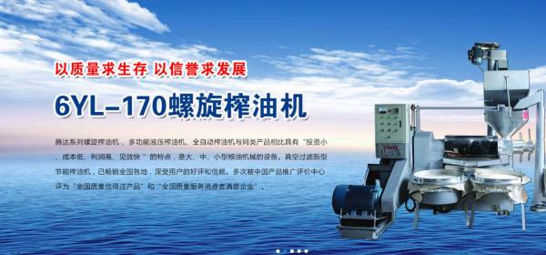 新野縣騰*機械制造有限公司多年來專業(yè)從事研究、開發(fā)、制造榨油機系列產(chǎn)品,所生產(chǎn)的系列螺旋榨油機, 多功能 液壓榨油機、全自動榨油機與同類產(chǎn)品相比具有“投 資小、成本低、利潤高、見效快 ”的特點,是大、中、小型糧油機械的設(shè)備。真空過濾新型節(jié)能榨油機,已遠銷全國各地,深受用戶的好評和信賴。多次被中國產(chǎn)品推廣評價中心評為“全國質(zhì)量信得過產(chǎn)品”和“全國質(zhì)量服務(wù)消費者滿意企業(yè)”。